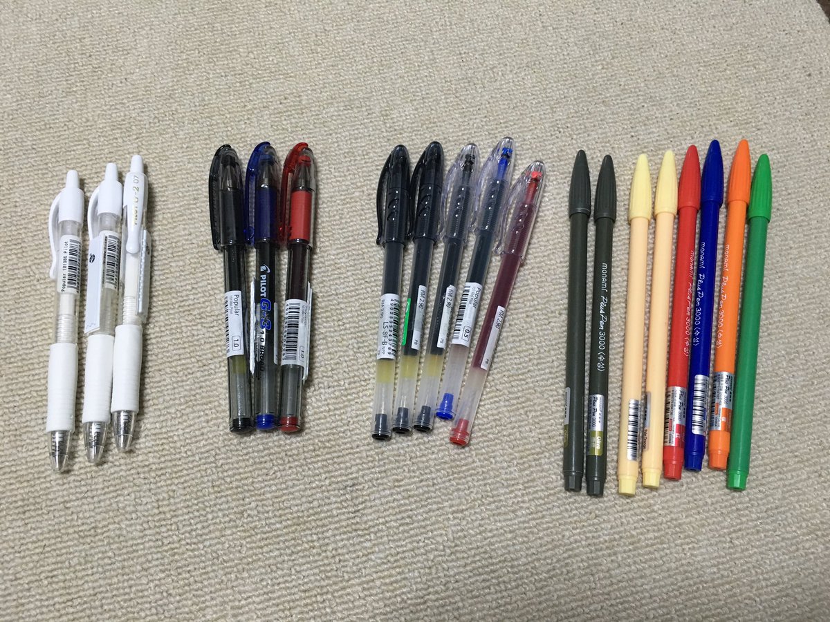 左から順にG2白、スモークG3(金属チップ)、スーパーゲル、monami Plus Pen 3000です。